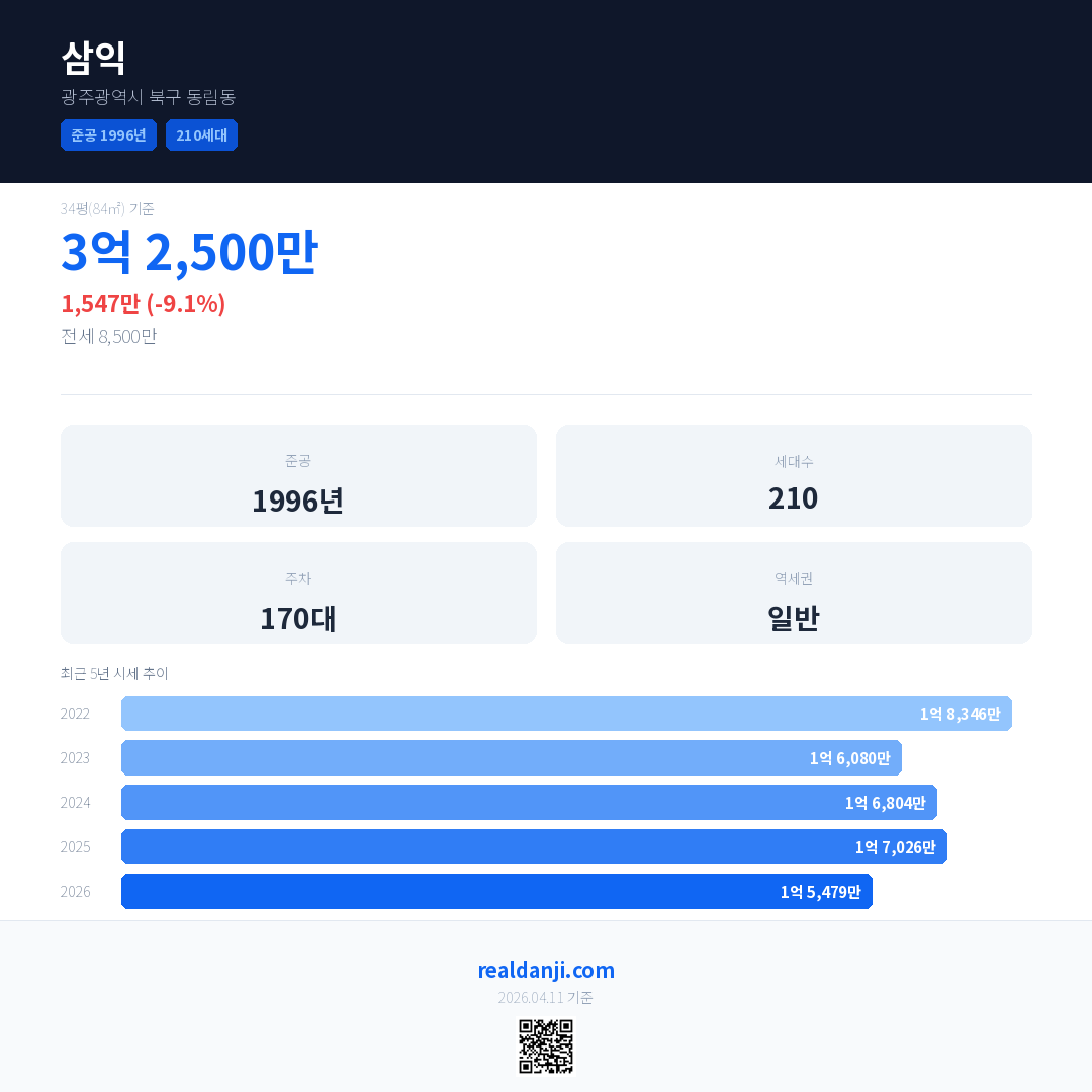 삼익 국민평형 기준 2026년 평균 거래가는 1억 5,479만으로, 전년 대비 9.1% 하락 했습니다.
