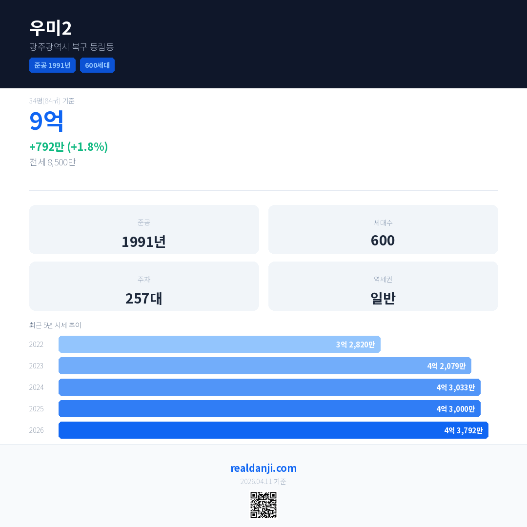 우미2 국민평형 기준 2026년 평균 거래가는 4억 3,792만으로, 전년 대비 1.8% 상승 했습니다.