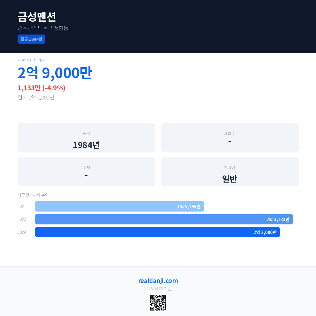 금성맨션 국민평형 기준 2024년 평균 거래가는 2억 2,000만으로, 전년 대비 4.9% 하락 했습니다.