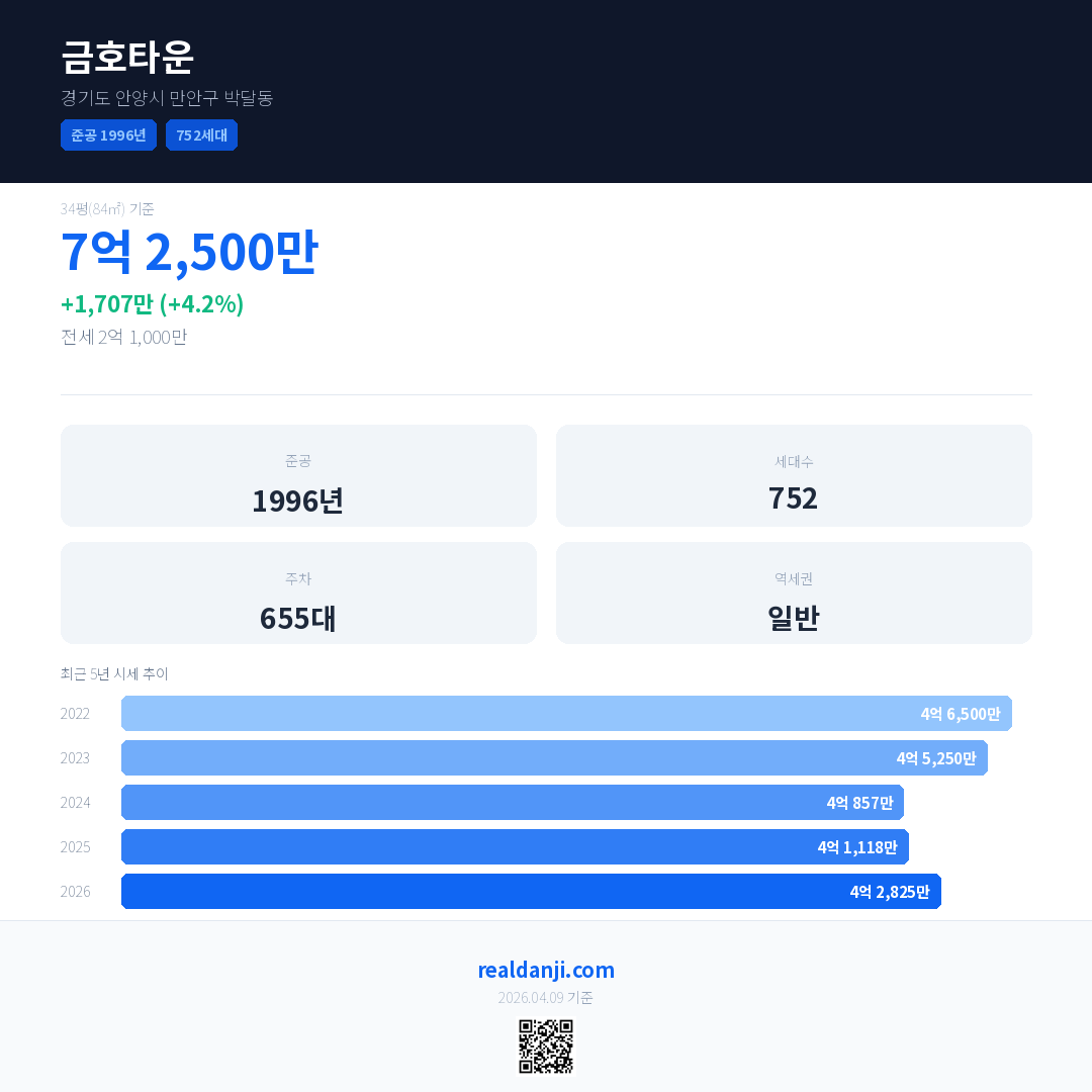 금호타운 최근 거래가는 7억 2,500만입니다. (2026-04)
