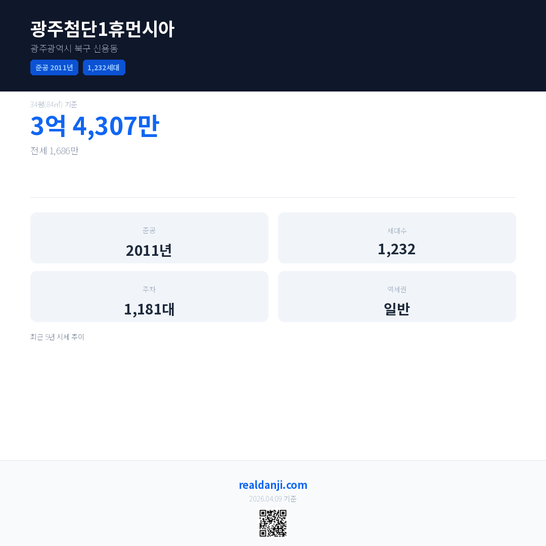 광주첨단1휴먼시아은(는) 2011년에 준공되었으며, 현재 15년차입니다. 총 1,232세대 규모입니다.