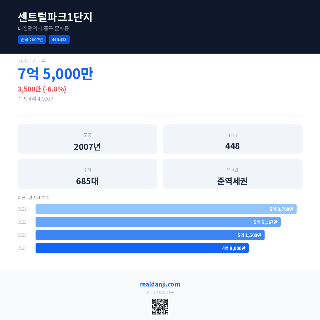 센트럴파크1단지 국민평형 기준 2025년 평균 거래가는 4억 8,000만으로, 전년 대비 6.8% 하락 했습니다.