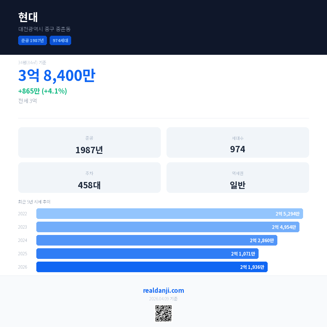 현대 국민평형 기준 2026년 평균 거래가는 2억 1,936만으로, 전년 대비 4.1% 상승 했습니다.