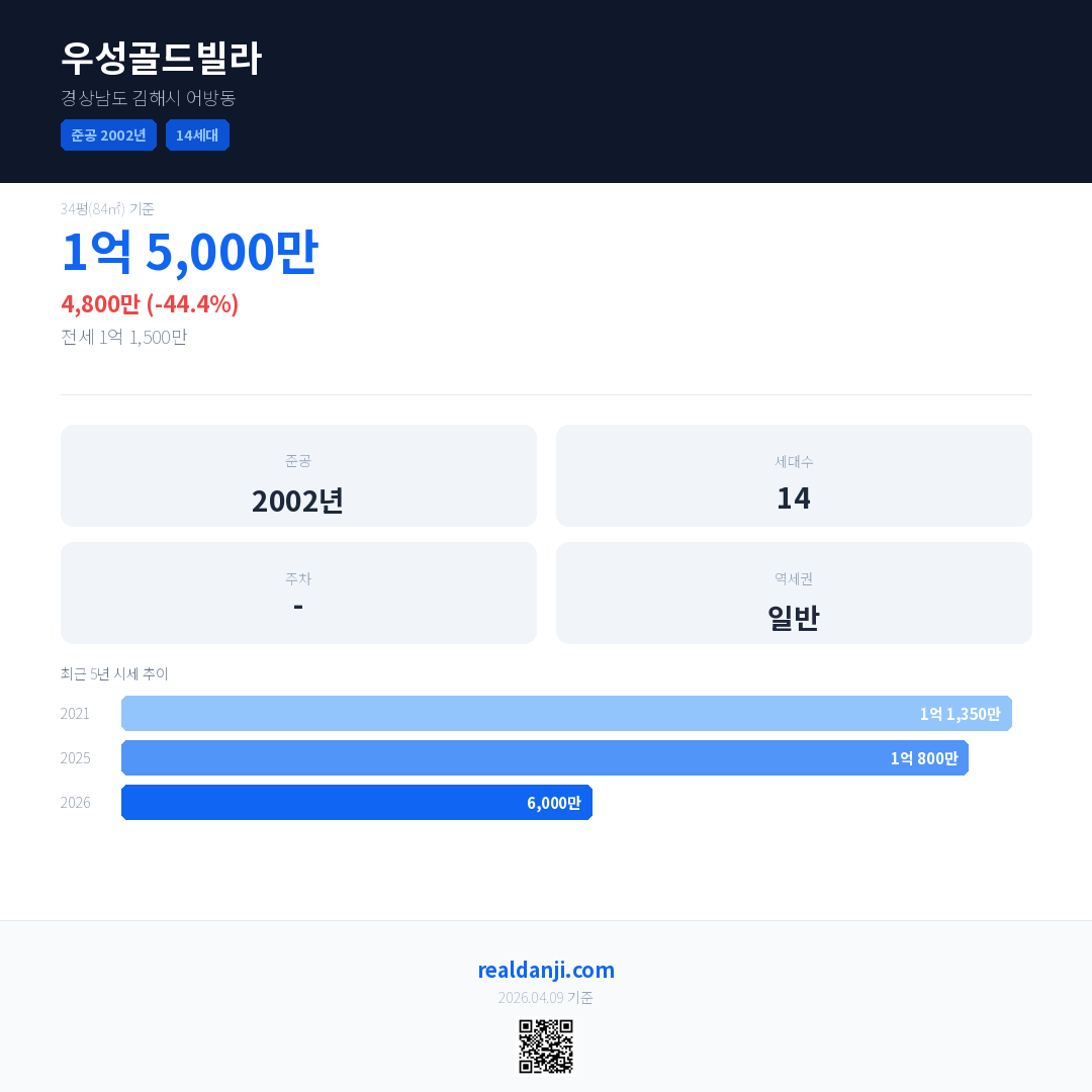 우성골드빌라 국민평형 기준 2026년 평균 거래가는 6,000만으로, 전년 대비 44.4% 하락 했습니다.