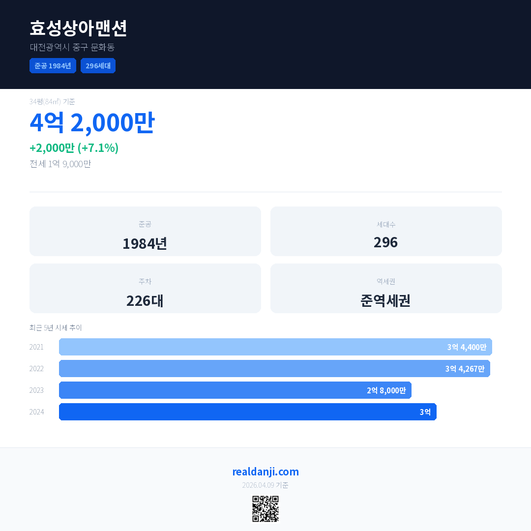 효성상아맨션은(는) 1984년에 준공되었으며, 현재 42년차입니다. 총 296세대 규모입니다.