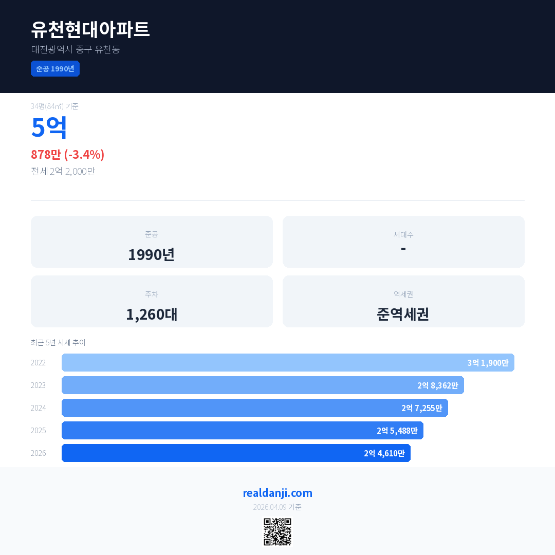 유천현대아파트 최근 거래가는 2억 2,000만입니다. (2026-04)
