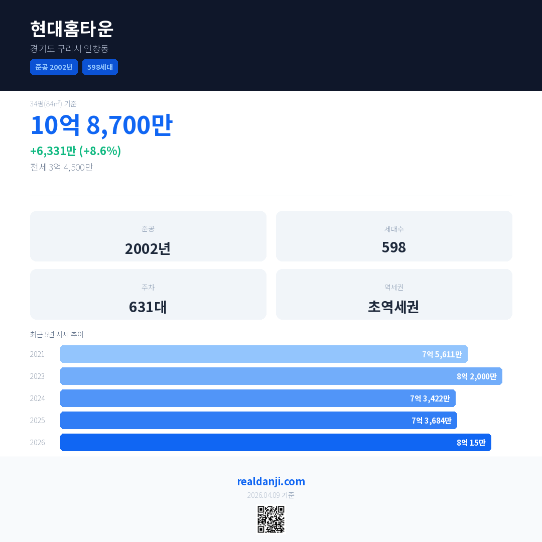 현대홈타운 국민평형 기준 2026년 평균 거래가는 8억 15만으로, 전년 대비 8.6% 상승 했습니다.