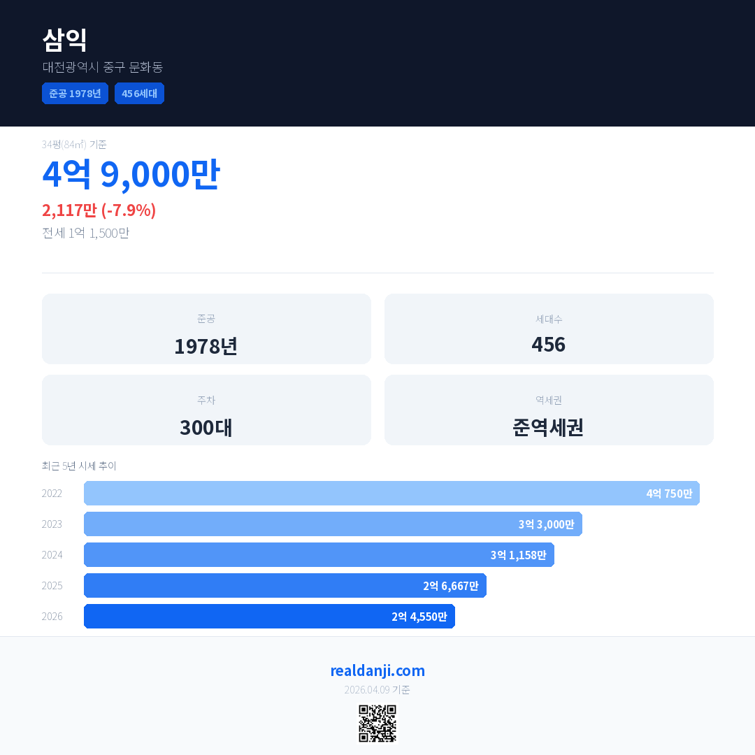삼익 국민평형 기준 2026년 평균 거래가는 2억 4,550만으로, 전년 대비 7.9% 하락 했습니다.