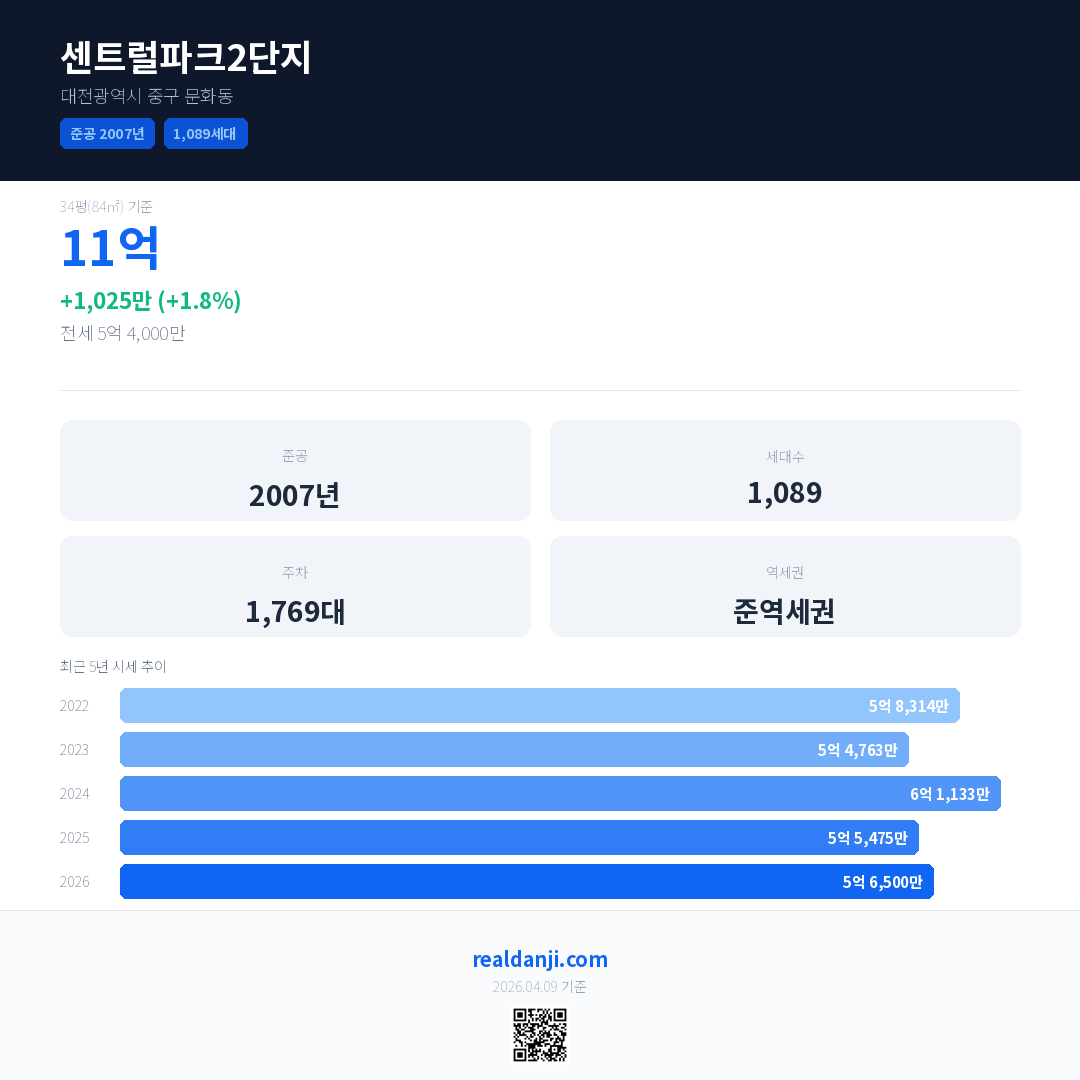 센트럴파크2단지 국민평형 기준 2026년 평균 거래가는 5억 6,500만으로, 전년 대비 1.8% 상승 했습니다.