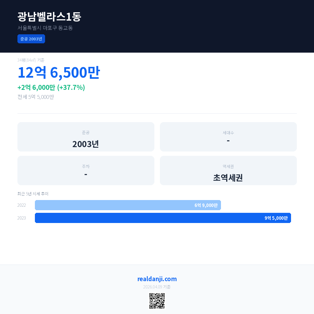 광남벨라스1동은(는) 2003년에 준공되었으며, 현재 23년차입니다.