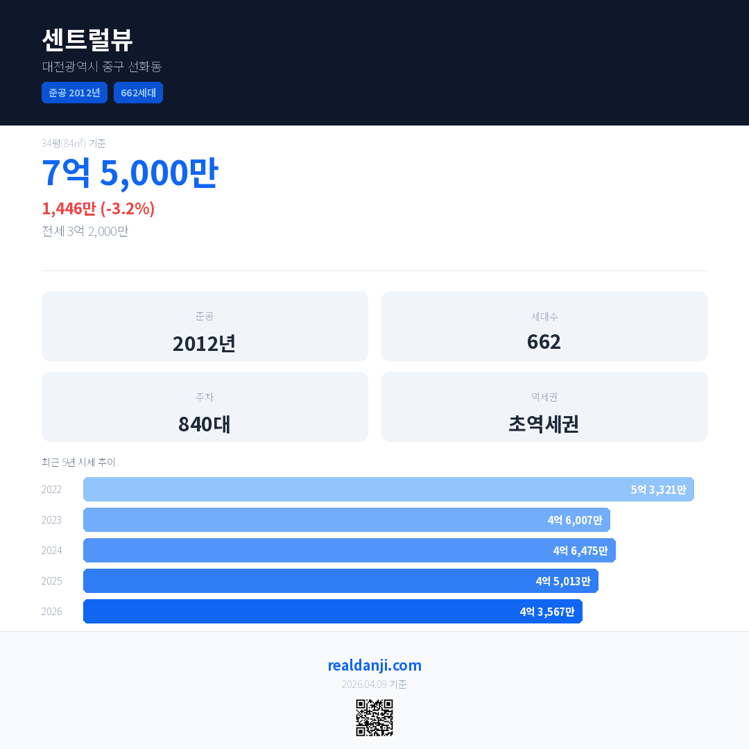 센트럴뷰 국민평형 기준 2026년 평균 거래가는 4억 3,567만으로, 전년 대비 3.2% 하락 했습니다.