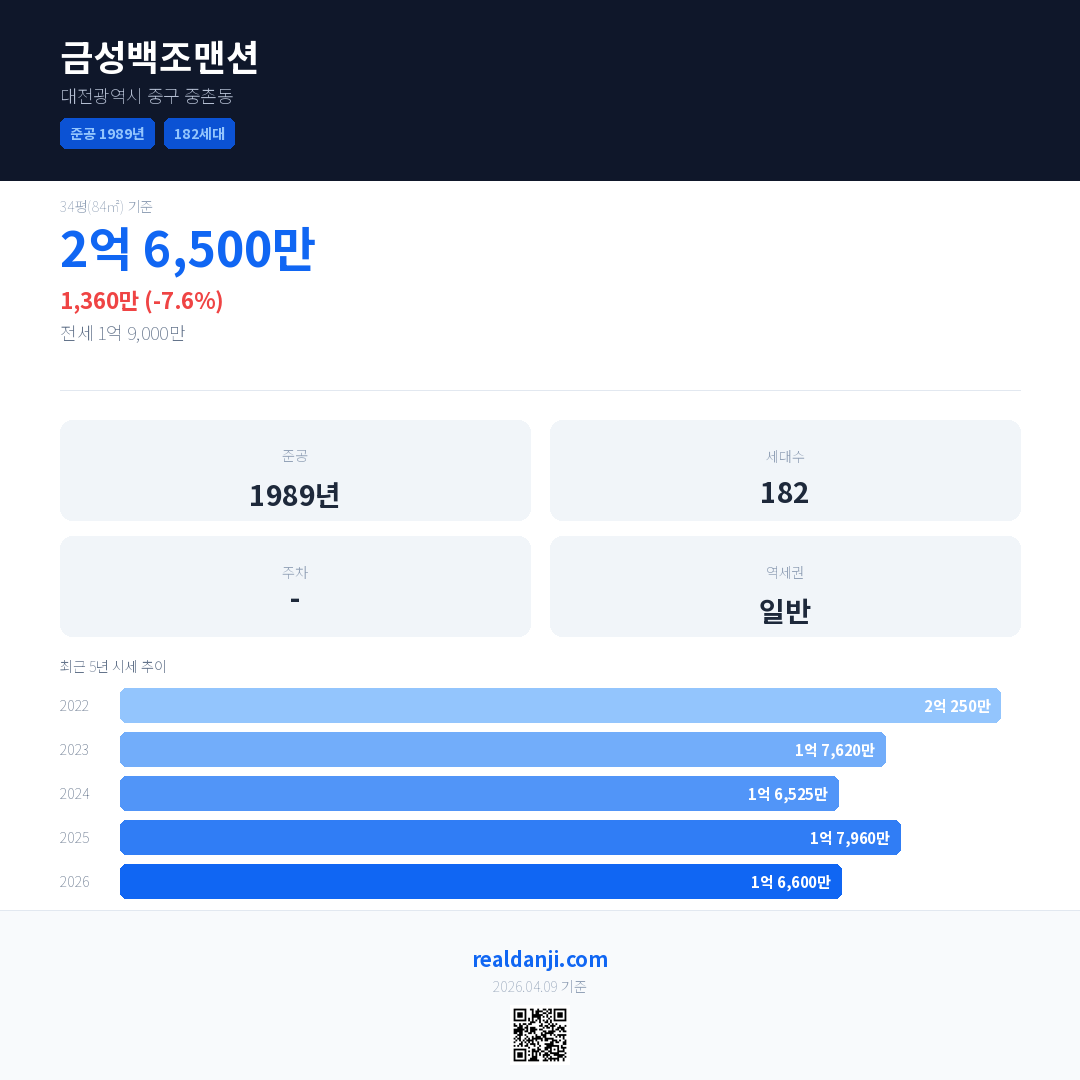금성백조맨션 국민평형 기준 2026년 평균 거래가는 1억 6,600만으로, 전년 대비 7.6% 하락 했습니다.