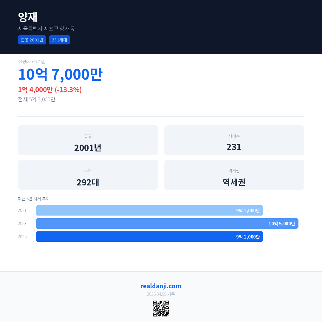 양재 국민평형 기준 2025년 평균 거래가는 9억 1,000만으로, 전년 대비 13.3% 하락 했습니다.