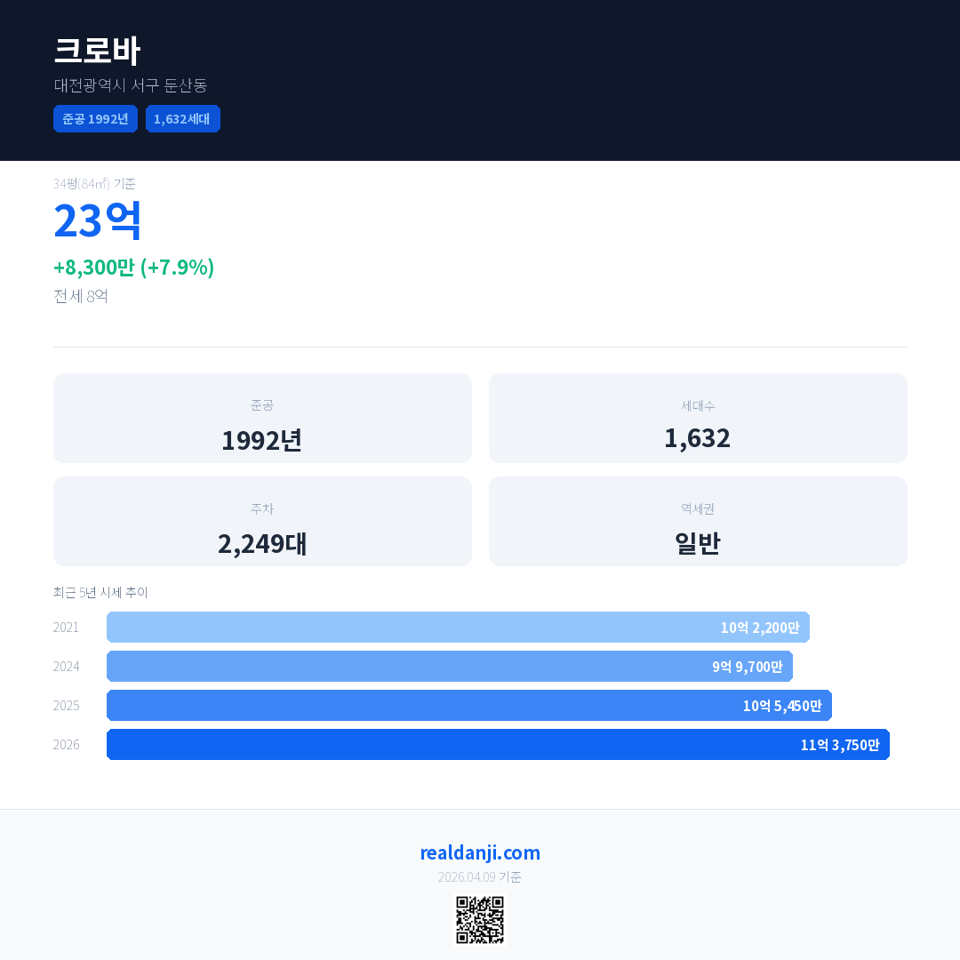 크로바 국민평형 기준 2026년 평균 거래가는 11억 3,750만으로, 전년 대비 7.9% 상승 했습니다.