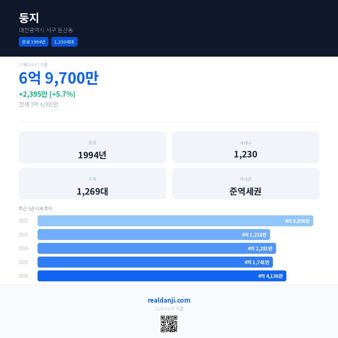 둥지 국민평형 기준 2026년 평균 거래가는 4억 4,136만으로, 전년 대비 5.7% 상승 했습니다.