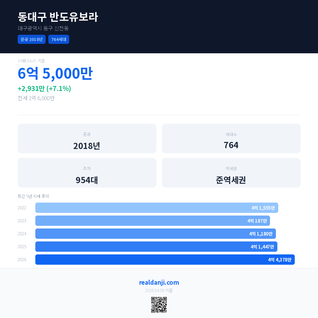 동대구 반도유보라 국민평형 기준 2026년 평균 거래가는 4억 4,378만으로, 전년 대비 7.1% 상승 했습니다.