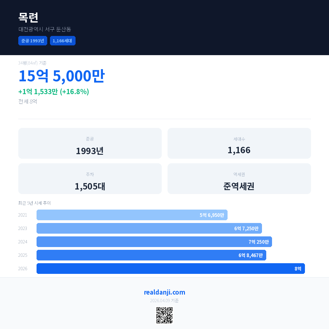 목련 국민평형 기준 2026년 평균 거래가는 8억으로, 전년 대비 16.8% 상승 했습니다.