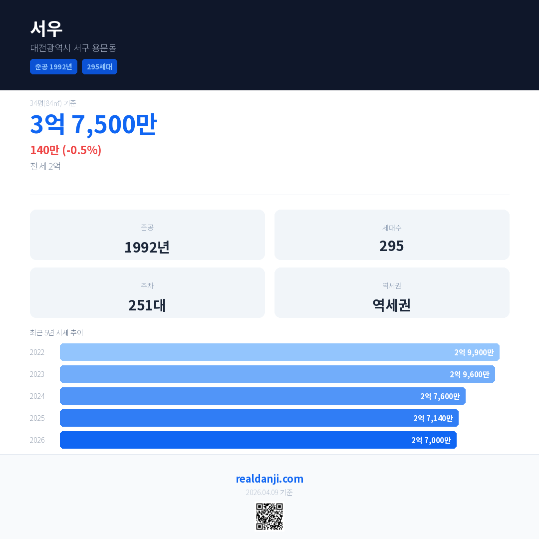 서우은(는) 1992년에 준공되었으며, 현재 34년차입니다. 총 295세대 규모입니다.