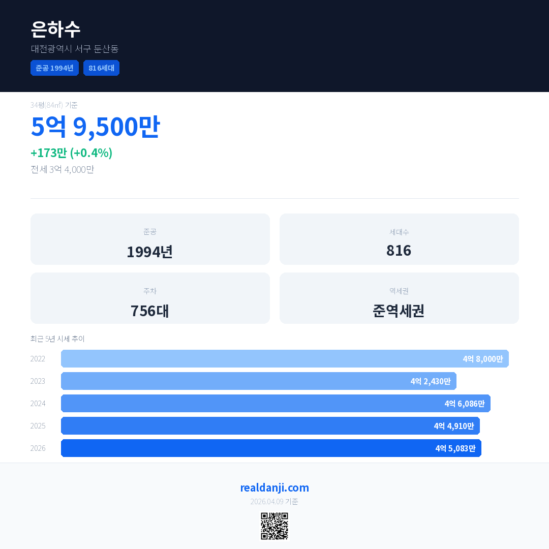 은하수 국민평형 기준 2026년 평균 거래가는 4억 5,083만으로, 전년 대비 0.4% 상승 했습니다.