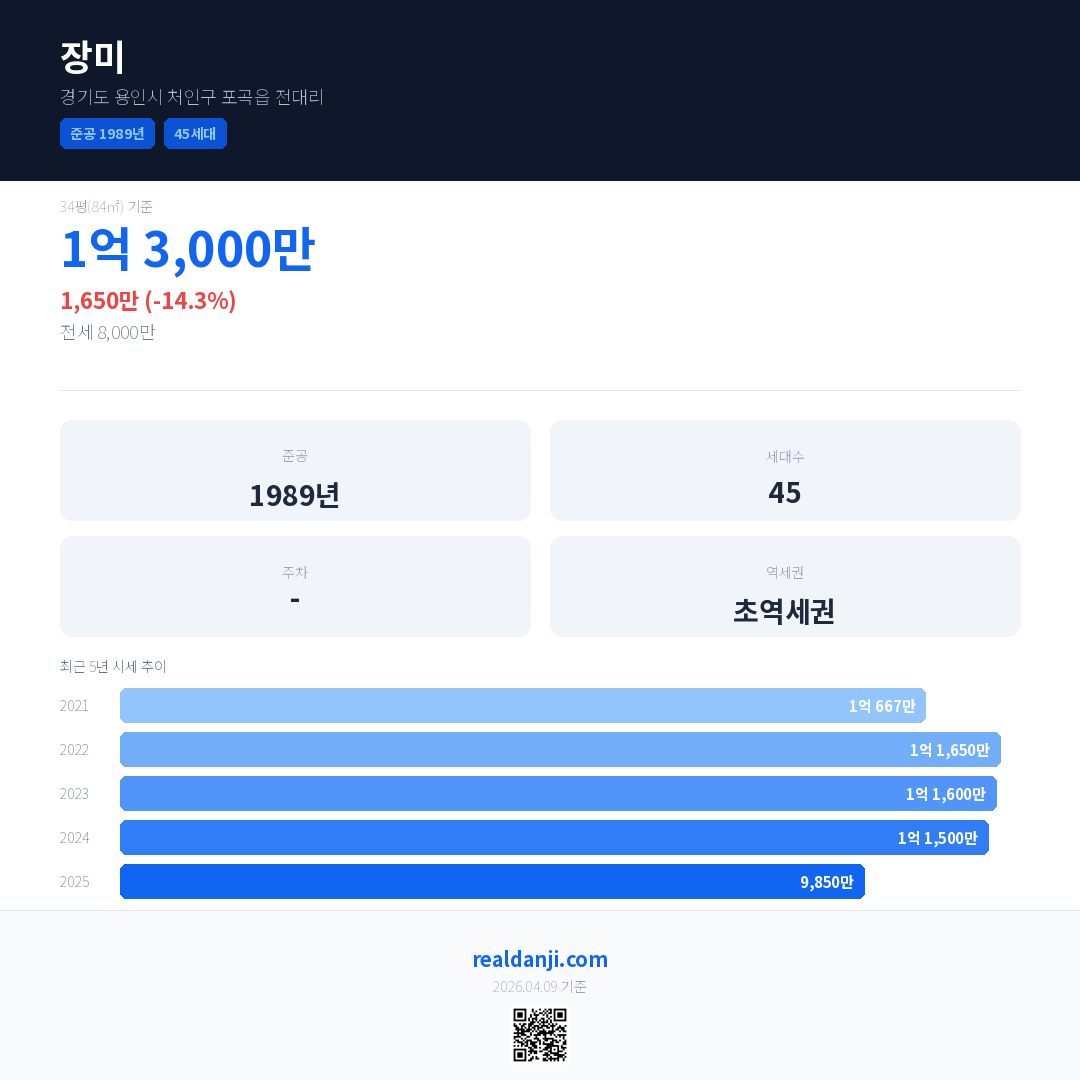 장미 국민평형 기준 2025년 평균 거래가는 9,850만으로, 전년 대비 14.3% 하락 했습니다.