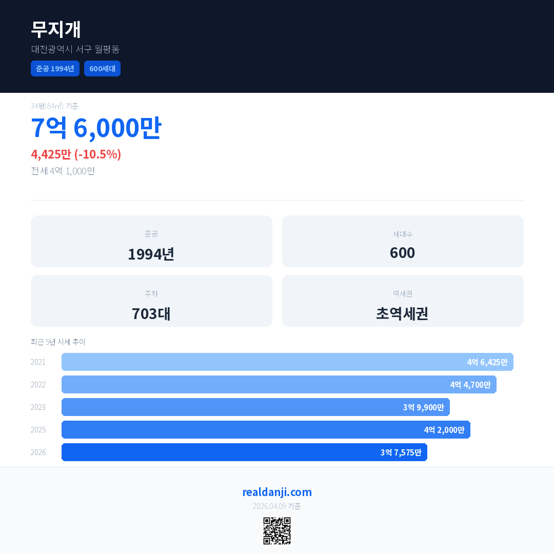 무지개 국민평형 기준 2026년 평균 거래가는 3억 7,575만으로, 전년 대비 10.5% 하락 했습니다.