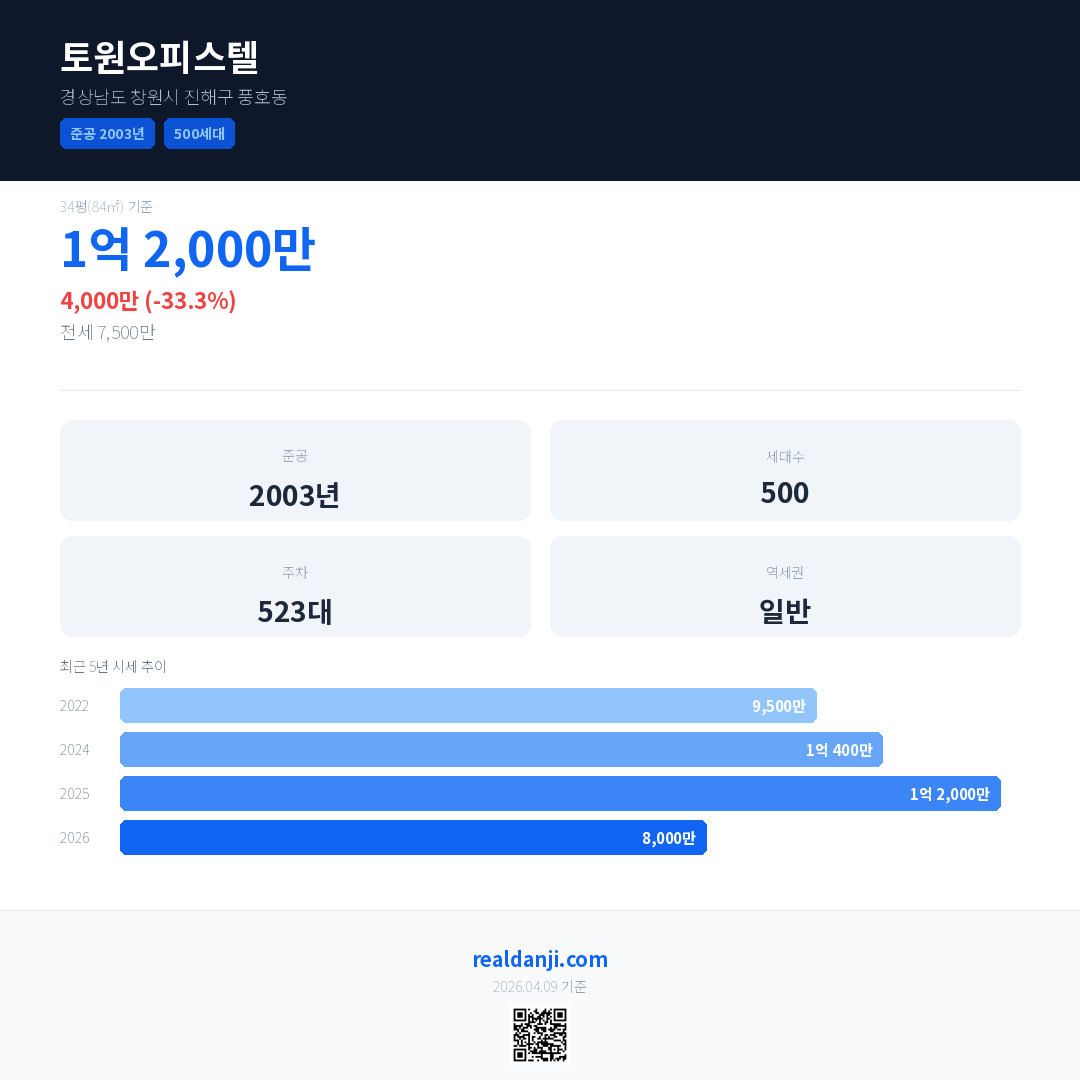 토원오피스텔 최근 거래가는 1억 2,000만입니다. (2026-04)