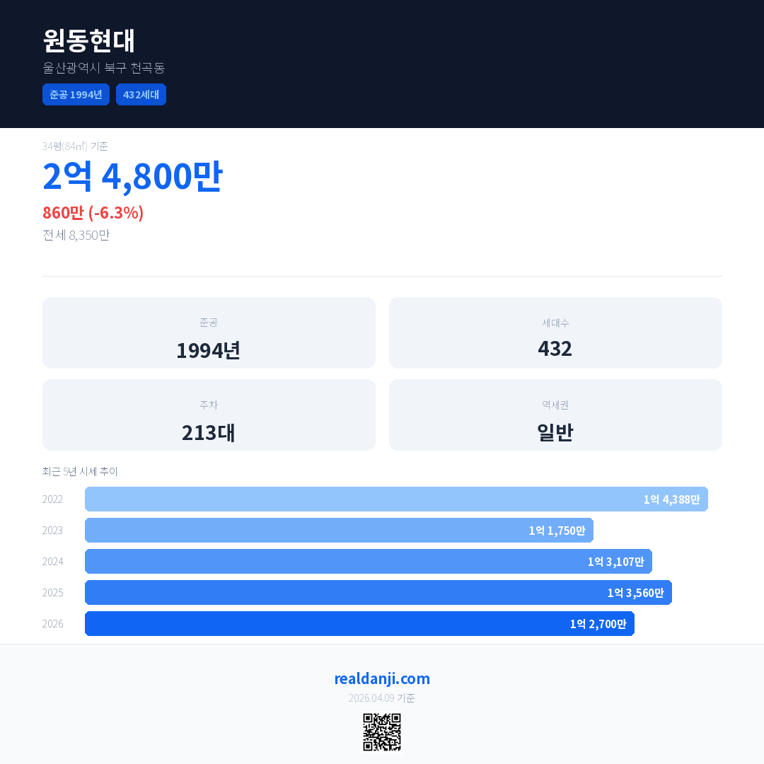 원동현대 최근 거래가는 1억 2,300만입니다. (2026-04)