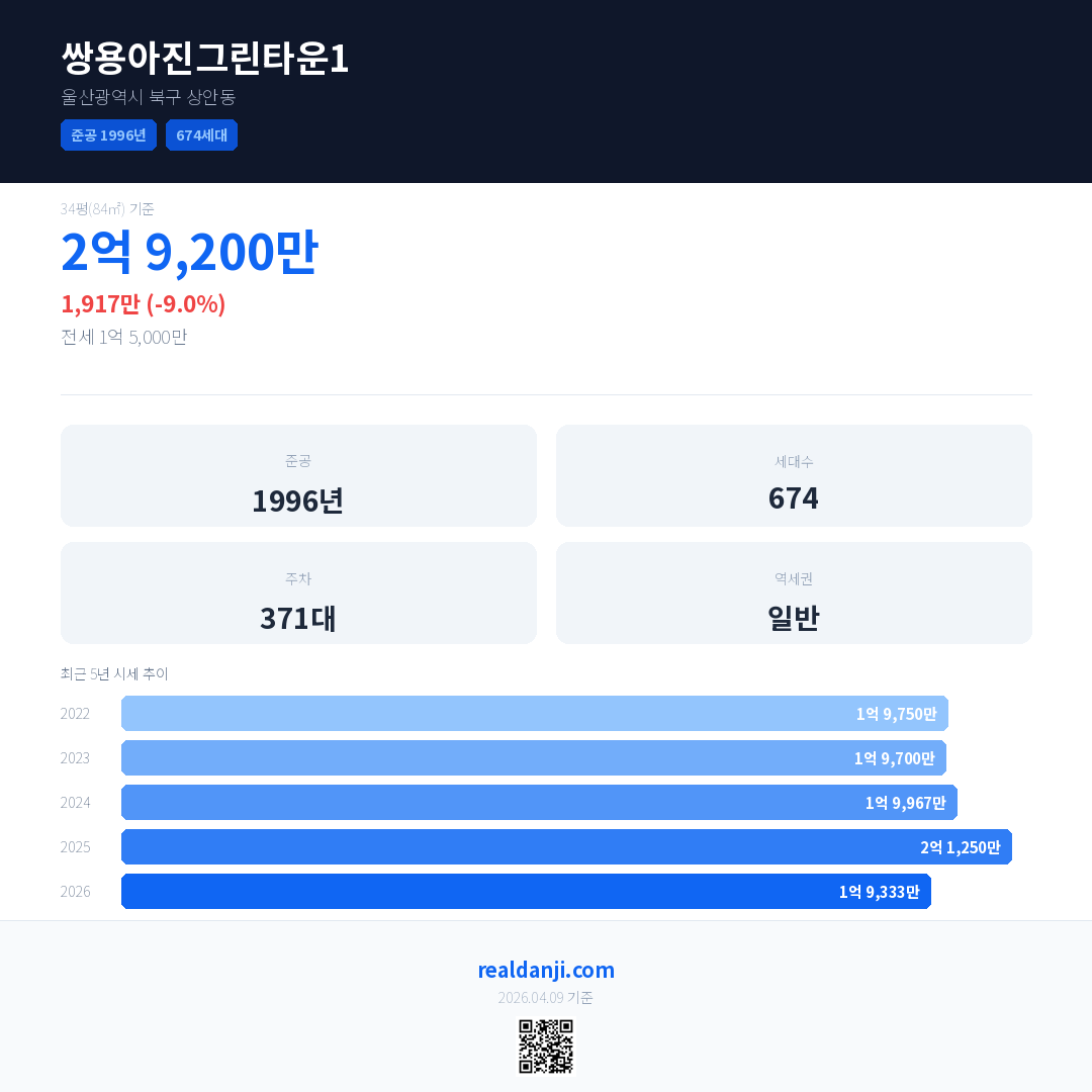 쌍용아진그린타운1 국민평형 기준 2026년 평균 거래가는 1억 9,333만으로, 전년 대비 9.0% 하락 했습니다.