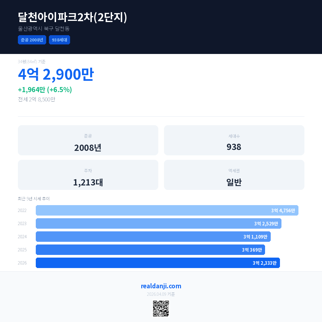 달천아이파크2차(2단지) 최근 거래가는 3억 5,500만입니다. (2026-04)