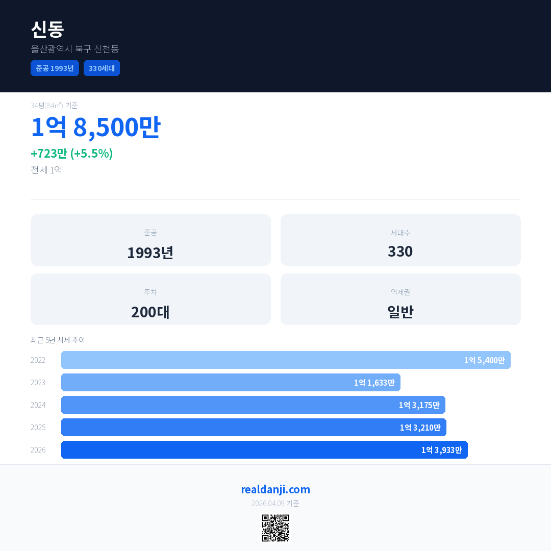 신동 최근 거래가는 1억 8,500만입니다. (2026-03)