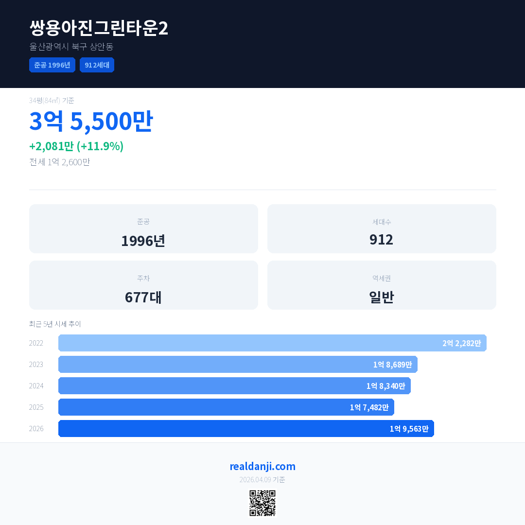 쌍용아진그린타운2 국민평형 기준 2026년 평균 거래가는 1억 9,563만으로, 전년 대비 11.9% 상승 했습니다.