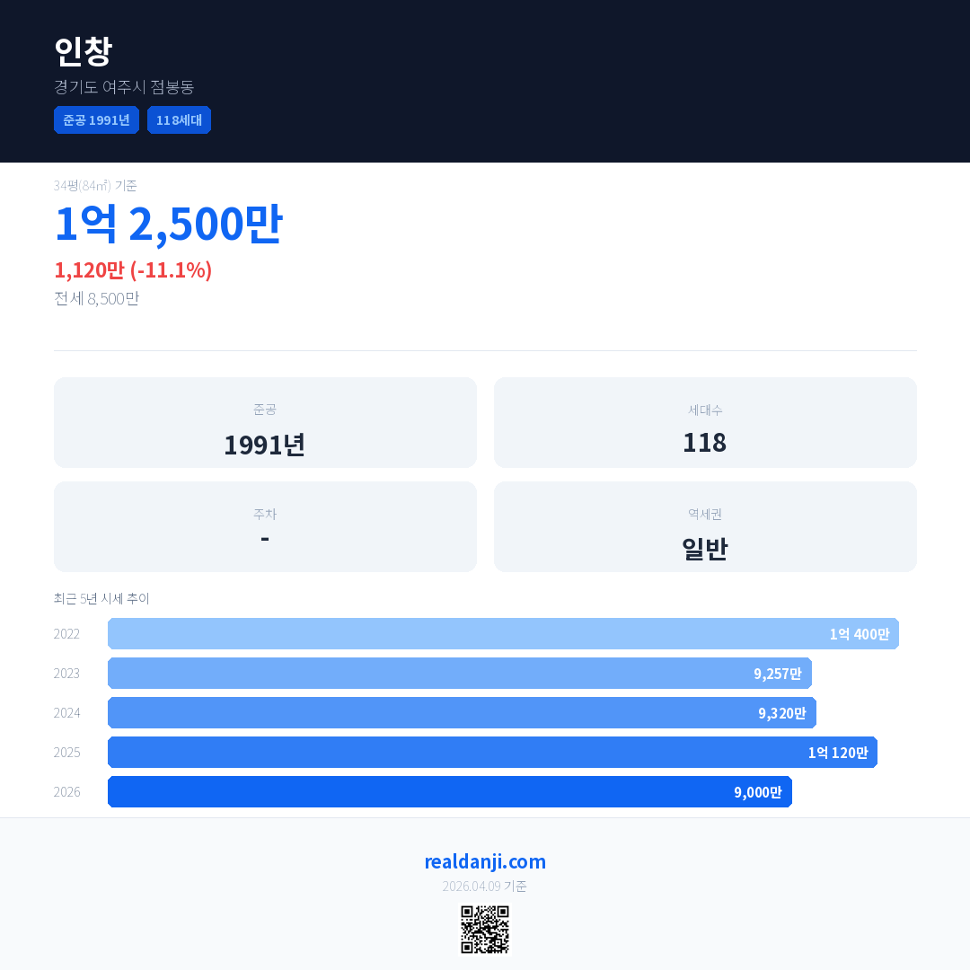 인창 국민평형 기준 2026년 평균 거래가는 9,000만으로, 전년 대비 11.1% 하락 했습니다.