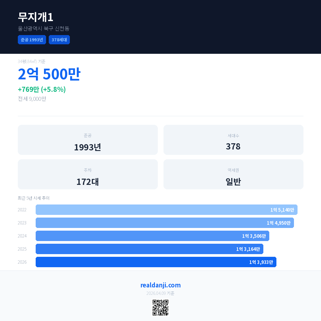 무지개1 국민평형 기준 2026년 평균 거래가는 1억 3,933만으로, 전년 대비 5.8% 상승 했습니다.