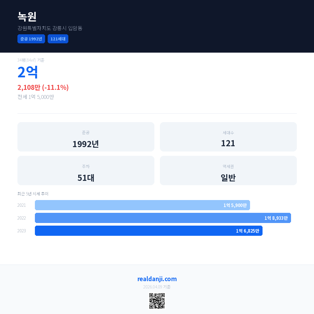녹원 국민평형 기준 2023년 평균 거래가는 1억 6,825만으로, 전년 대비 11.1% 하락 했습니다.