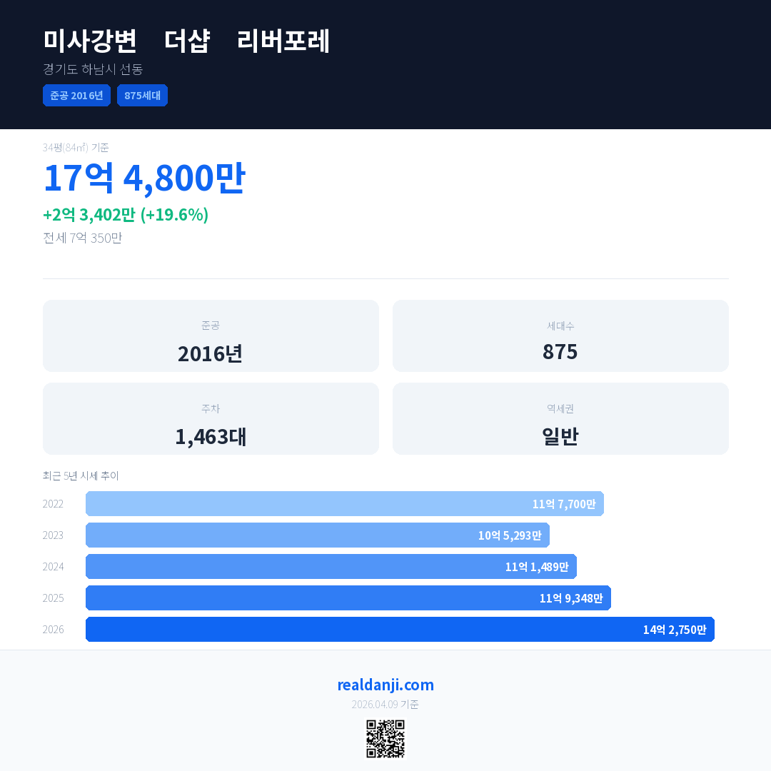 미사강변 더샵 리버포레 최근 거래가는 17억 4,800만입니다. (2026-03)