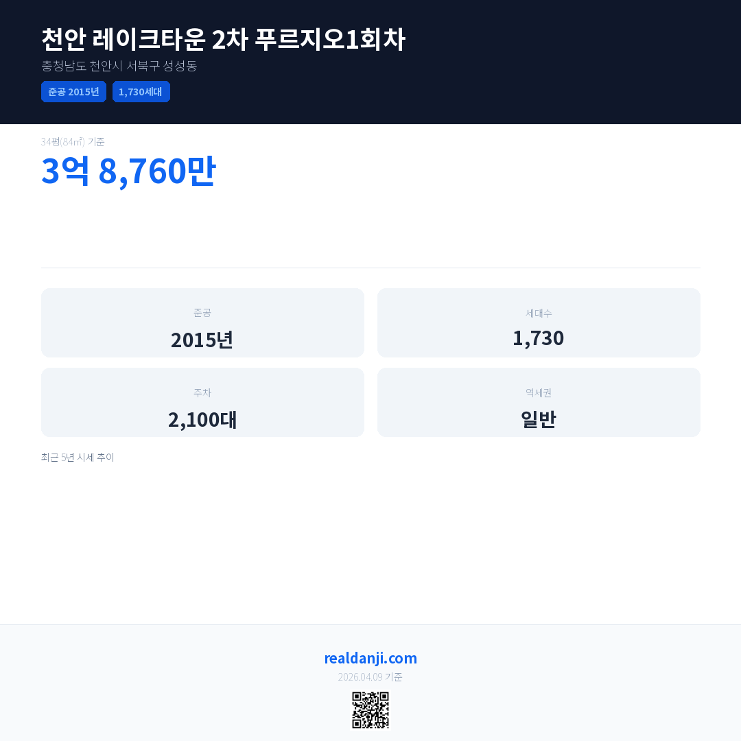 천안 레이크타운 2차 푸르지오1회차 최근 거래가는 3억 8,760만입니다. (2018-01)