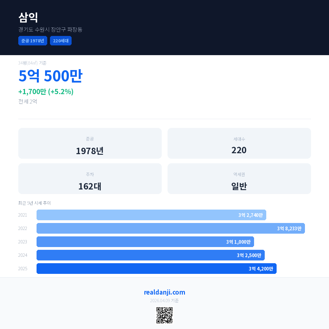 삼익 국민평형 기준 2025년 평균 거래가는 3억 4,200만으로, 전년 대비 5.2% 상승 했습니다.