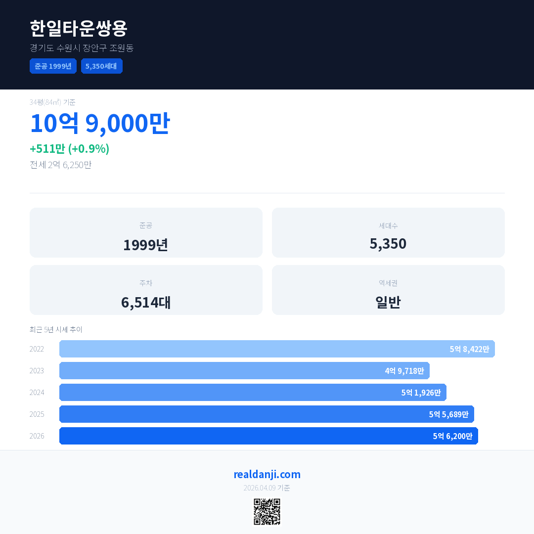 한일타운쌍용은(는) 1999년에 준공되었으며, 현재 27년차입니다. 총 5,350세대 규모입니다.
