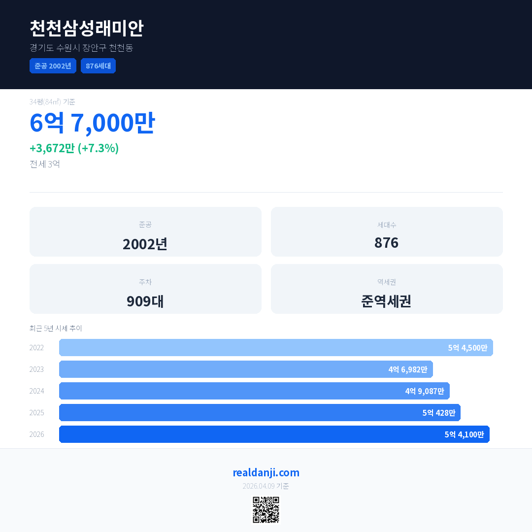 천천삼성래미안 국민평형 기준 2026년 평균 거래가는 5억 4,100만으로, 전년 대비 7.3% 상승 했습니다.