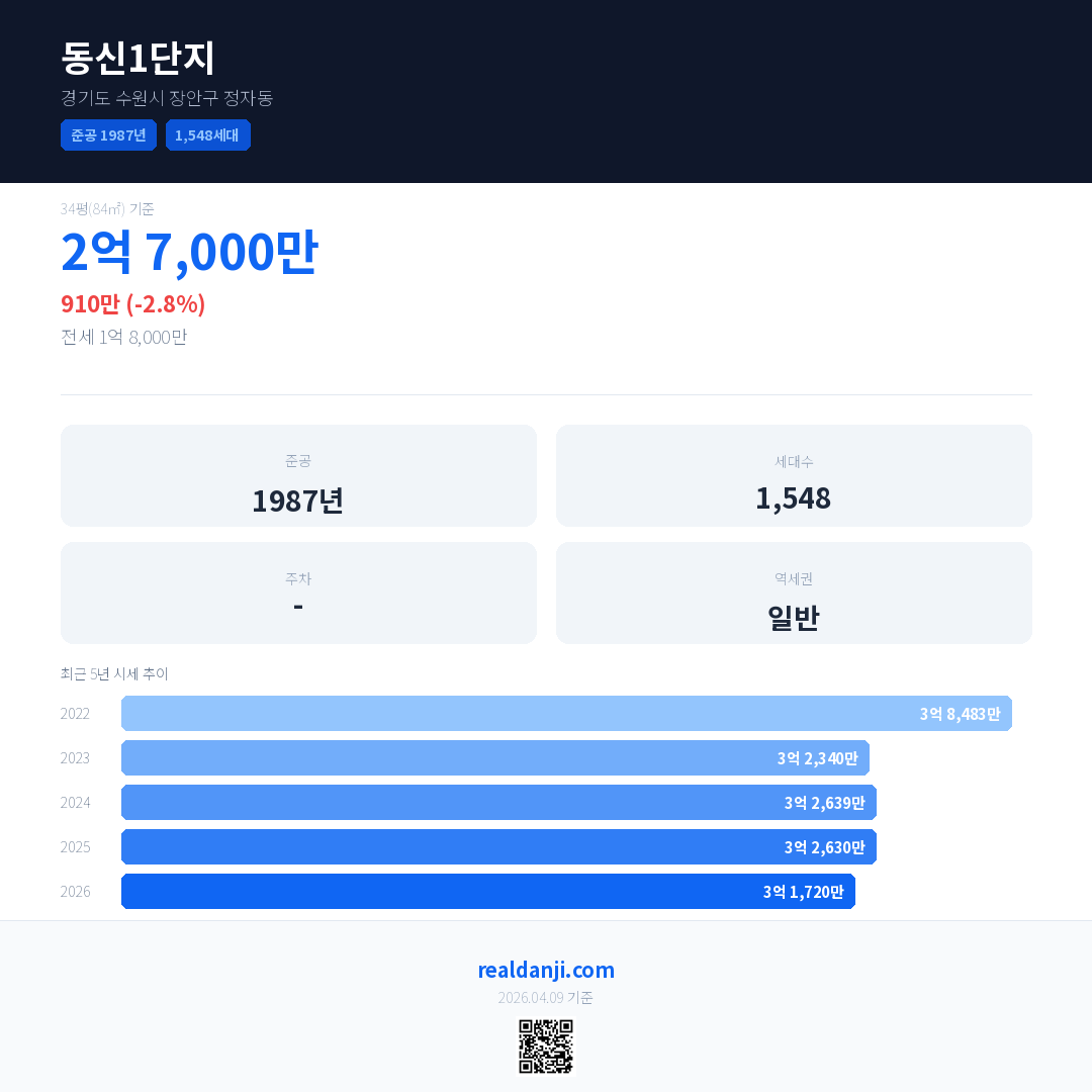 동신1단지 국민평형 기준 2026년 평균 거래가는 3억 1,720만으로, 전년 대비 2.8% 하락 했습니다.