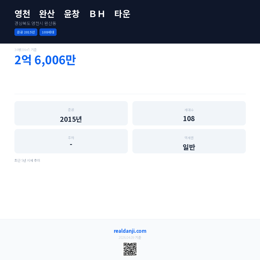 영천 완산 윤창 BH 타운은(는) 2015년에 준공되었으며, 현재 11년차입니다. 총 108세대 규모입니다.