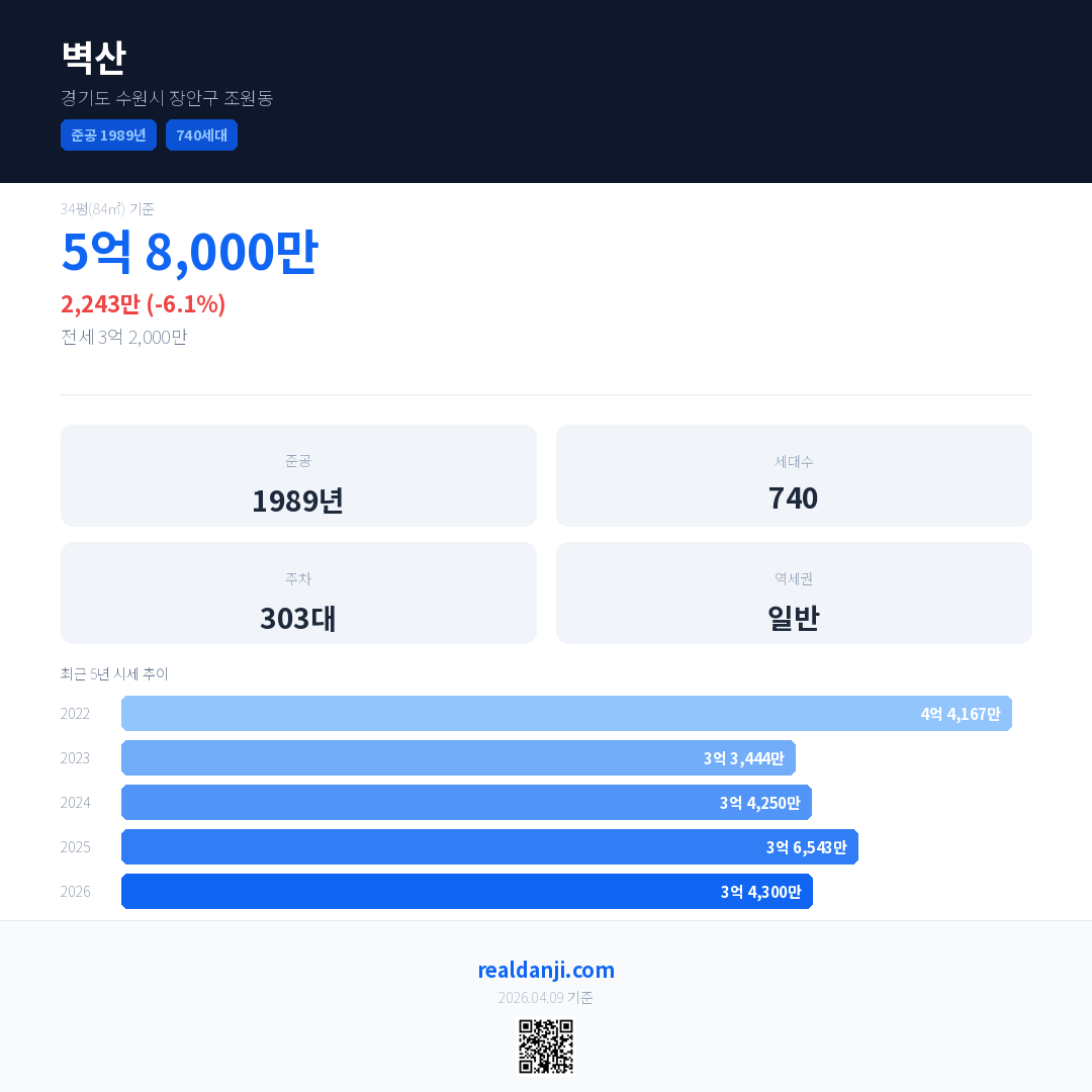 벽산 국민평형 기준 2026년 평균 거래가는 3억 4,300만으로, 전년 대비 6.1% 하락 했습니다.