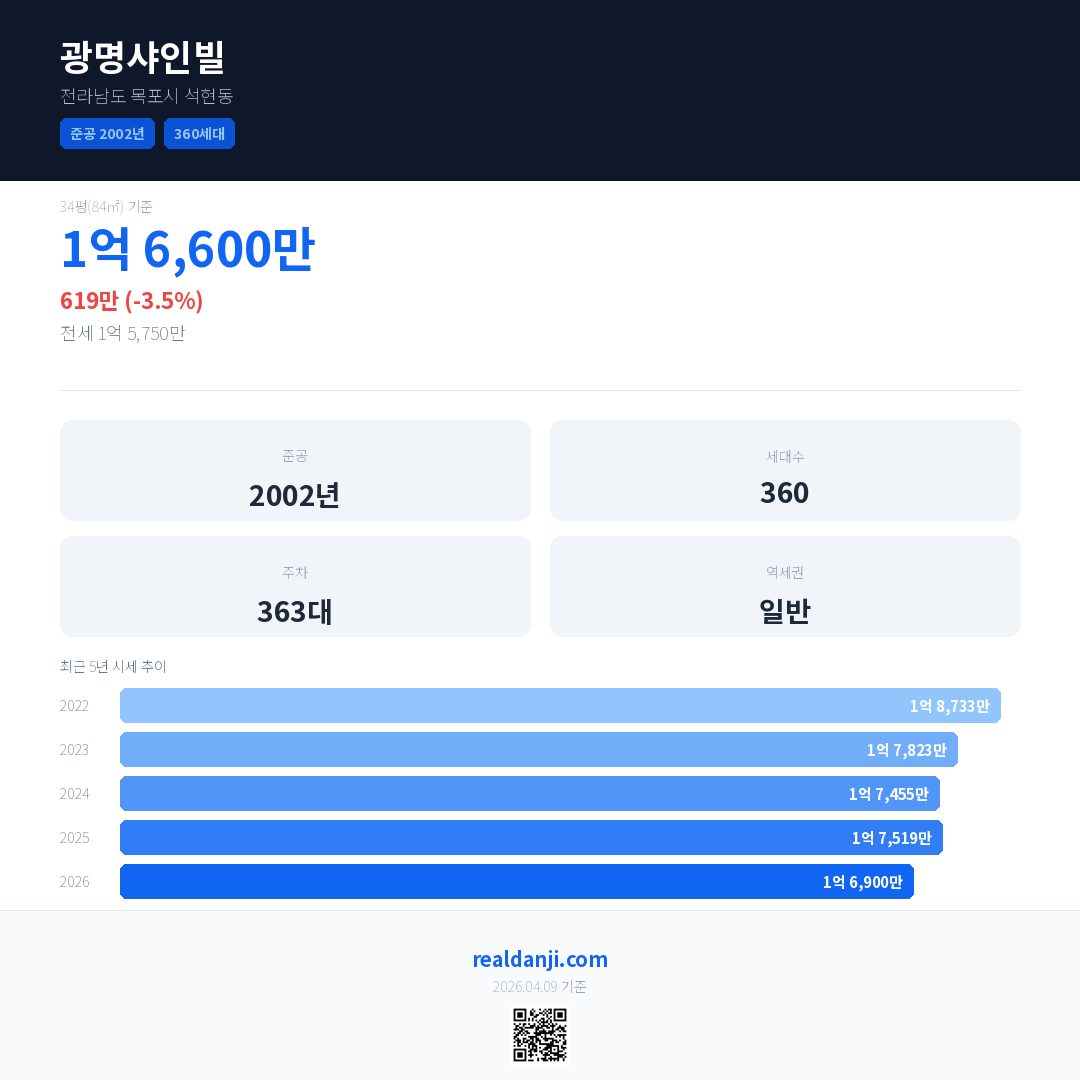 광명샤인빌 국민평형 기준 2026년 평균 거래가는 1억 6,900만으로, 전년 대비 3.5% 하락 했습니다.