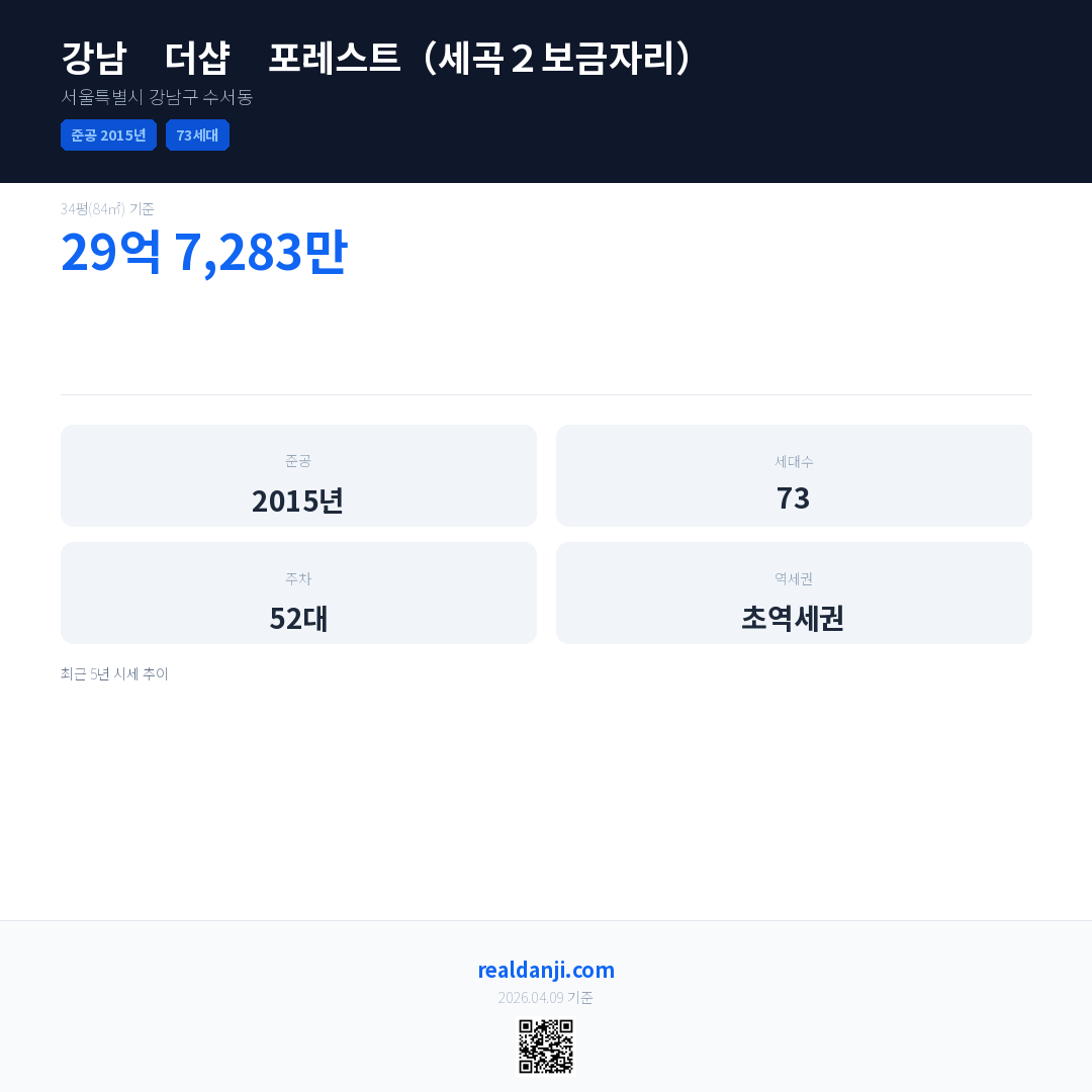 강남 더샵 포레스트(세곡2보금자리)은(는) 2015년에 준공되었으며, 현재 11년차입니다. 총 73세대 규모입니다.