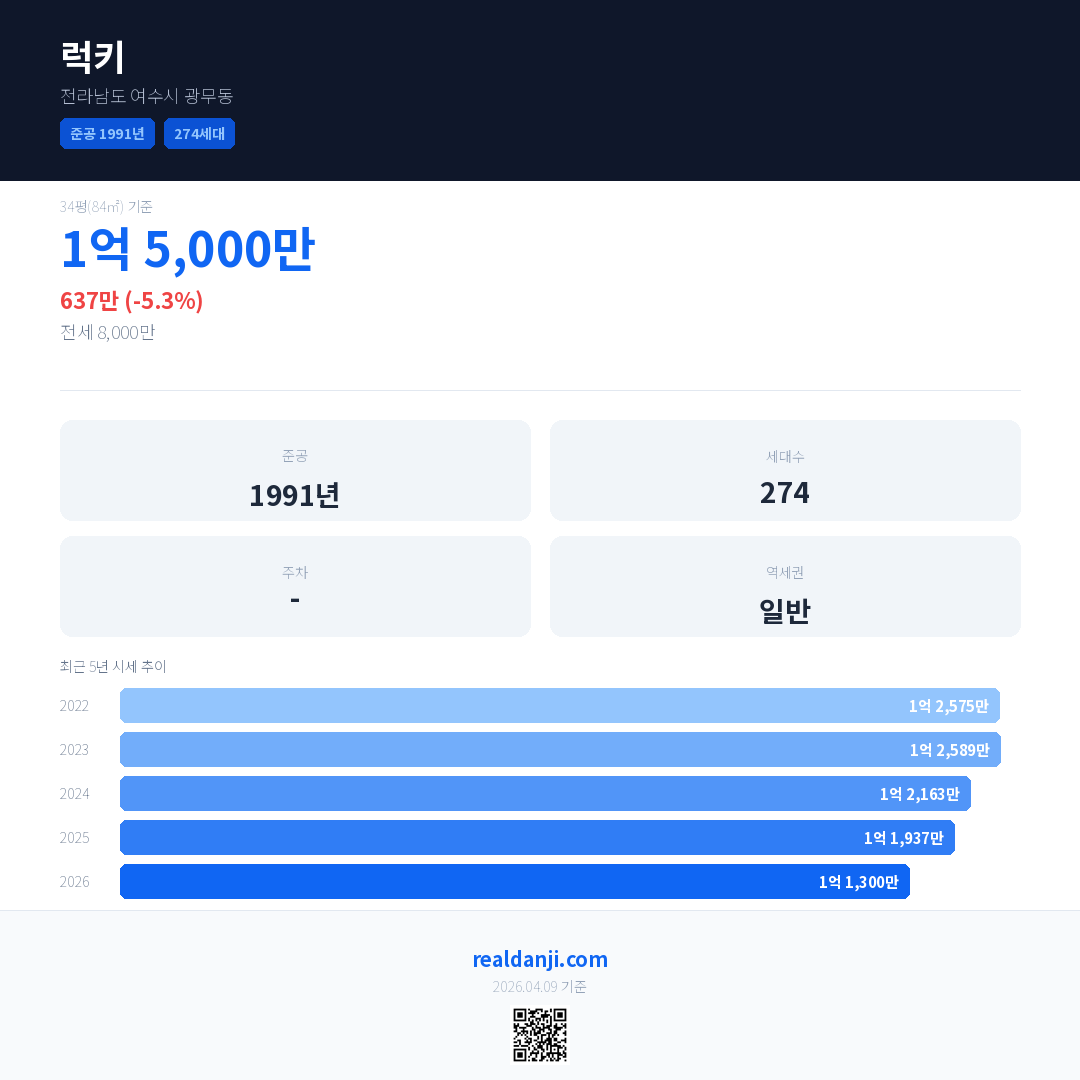 럭키 국민평형 기준 2026년 평균 거래가는 1억 1,300만으로, 전년 대비 5.3% 하락 했습니다.