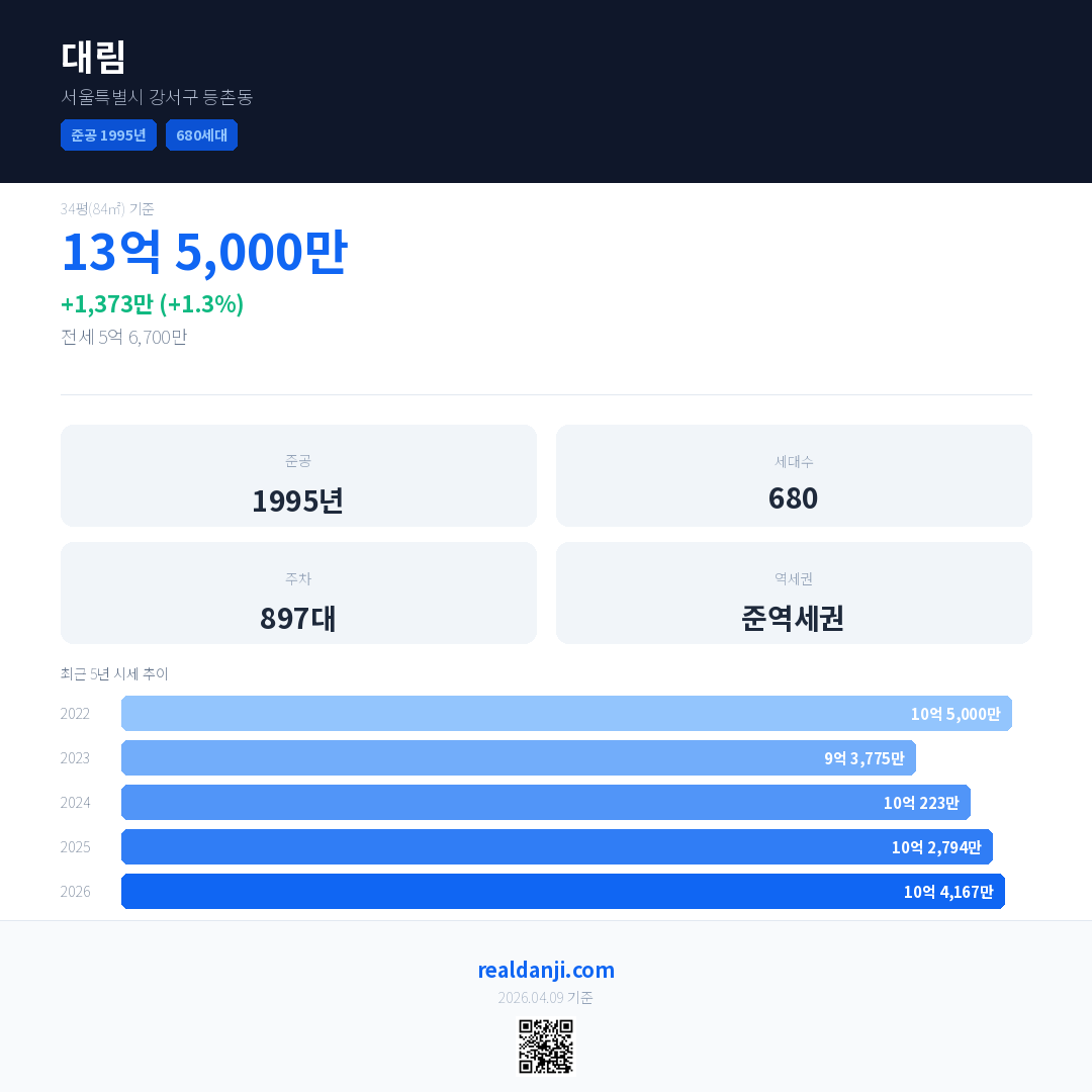 대림 국민평형 기준 2026년 평균 거래가는 10억 4,167만으로, 전년 대비 1.3% 상승 했습니다.