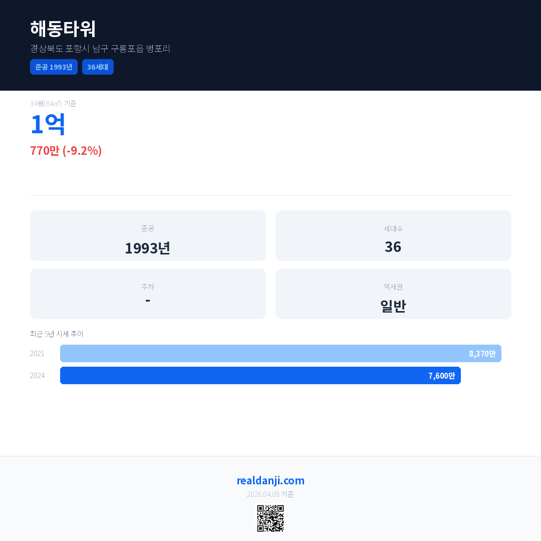 해동타워 최근 거래가는 1억입니다. (2024-04)