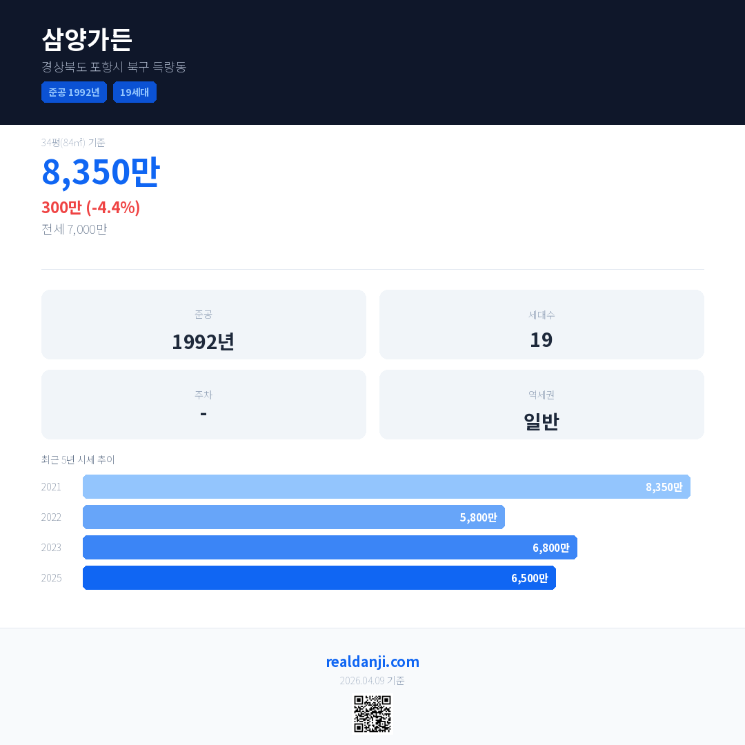 삼양가든 최근 거래가는 8,350만입니다. (2025-10)