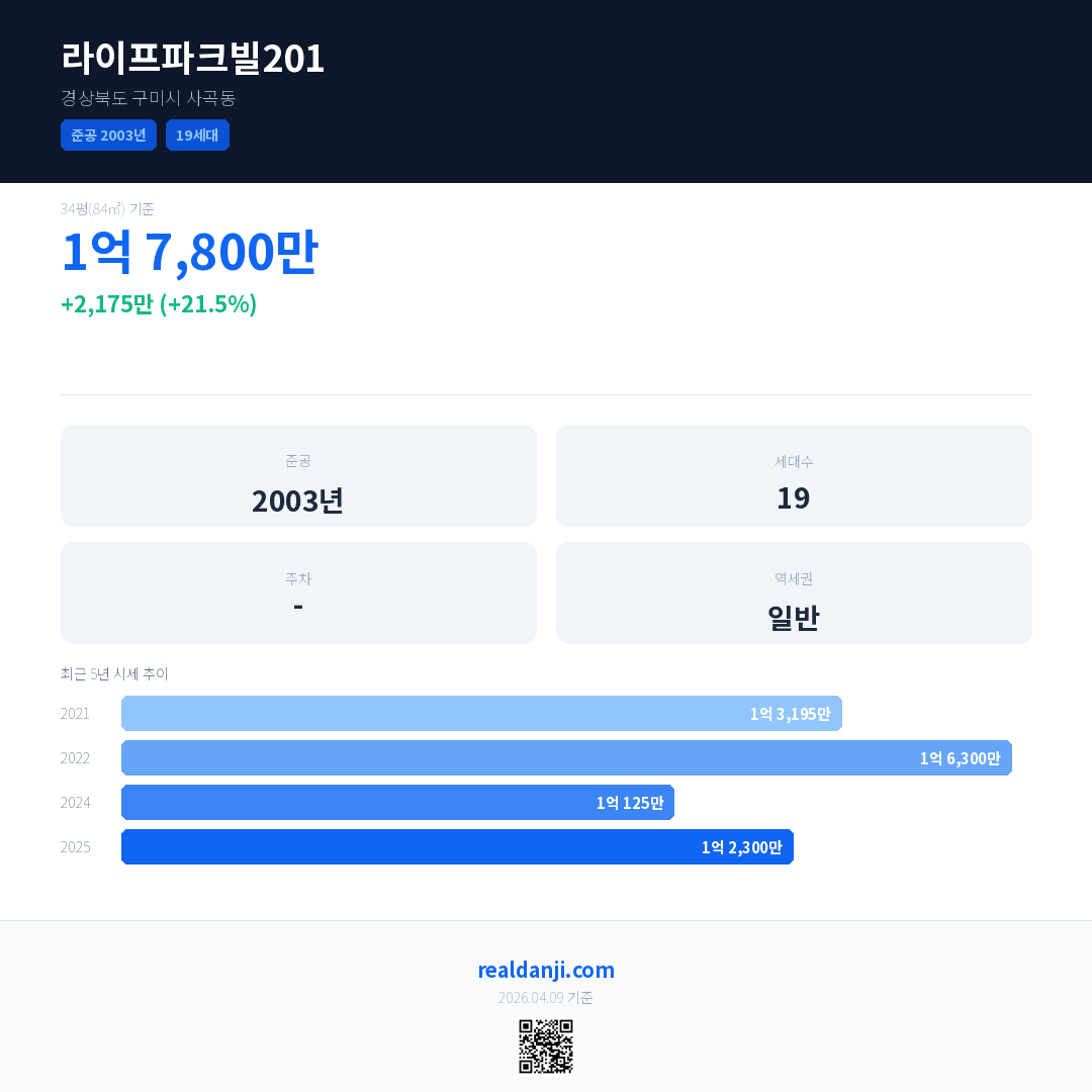 라이프파크빌201 국민평형 기준 2025년 평균 거래가는 1억 2,300만으로, 전년 대비 21.5% 상승 했습니다.