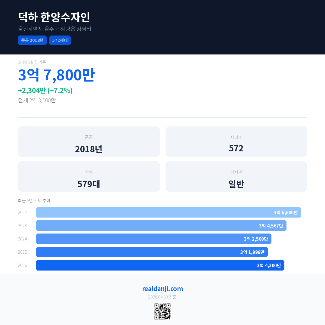 덕하 한양수자인 국민평형 기준 2026년 평균 거래가는 3억 4,300만으로, 전년 대비 7.2% 상승 했습니다.